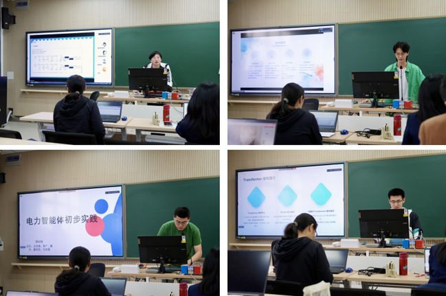 学生实践课题包括“电力图谱”、“电力视觉”、“电力大模型”、“电力智能体”、“电力数据分析”、“基于Atlas开发板的电力视觉应用”等六类人工智能技术在电力行业的应用,共17支团队参加课程实践答辩展示。实践作品涵盖了边端结合的绝缘子故障检测、基于强化学习的电力需求侧管理(含动态电价激励、直接负荷控制、用户用电预测)、光伏电池损伤检测、负荷管理智能体、电力预测与智能优化、3003新葡的京集团图谱、电力大模型问答系统、基于强化学习的风光储联合调度、电力仪表识别等能源电力行业“发电-输电-配电-用电-储能”各应用场景。在课程答辩现场,各小组结合生动案例向在场师生们阐述了研究思路、方法和创新点,展示了课题研究成果。