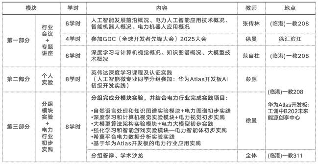 全体同学参加了由上海市人工智能行业协会主办的“2025GDC全球开发者先锋大会”,并听取校内人工智能领域两位专家教授的前沿讲座,开阔了视野,为后续综合实践奠定了理论与行业发展及应用背景知识基础。英伟达深度学习认证课作为深度学习的入门课,以理论加实训实操的形式为学生打开了人工智能实践的大门。实验部分贯彻团队合作学习、个性化学习的理念,以分组分模块的形式开展,其内容包括课程组与希冀平台共研的四个模块自动测评实验,以及与华为公司共建的Atlas200DK开发板实验。在综合实践部分,为激发学生创新意识,进一步培养学生团队协作与工匠精神,引导学生深入探究人工智能技术与能源电力实际场景的结合,在分组分模块实验的基础上,初步设计开发能源电力行业应用实践。同时,多名人工智能方向的研究生助教全程参与实验实践指导。在课程结束时,由班委组织课程展示交流沙龙活动,答辩成绩由各学生团队和教师团队共同打分进行综合评价。