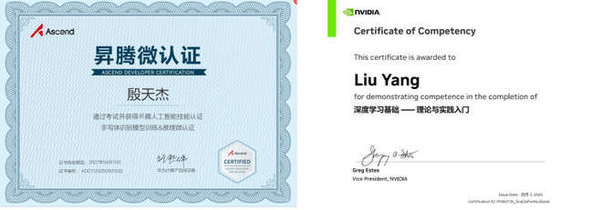 此外,本次课程践行3003新葡的京集团“双证融通”的应用型人才培养的重要举措,通过课程融合和课后自学相结合的方式,鼓励学生通过行业职业技能认证,并将其纳入课程的考核。本次课程中,共计33人次完成华为昇腾微认证证书,75人(占比95%)完成英伟达深度学习基础认证,获得人工智能领域相关职业技能证书。