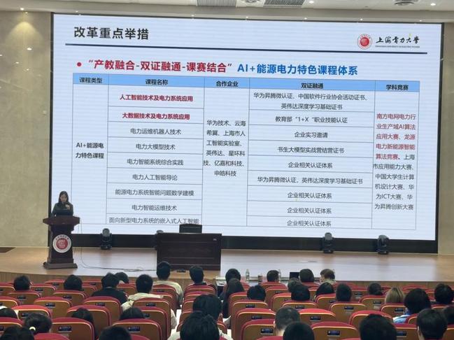 教学秘书徐曼详细解读了改革试点方案的核心内容。学院将围绕“AI+能源电力”特色,重构课程体系,新增《电力智能系统综合实践》等实践课程,并在专业核心课程中嵌入电力设备故障预测、新能源优化等企业真实案例。实践教学环节占比提升,学生可通过企业实习、行业认证、科创竞赛等多元化方式完成“3+X”综合实习实践学分。此外,学院积极建设“智慧能源AI全栈平台”,开展集成智能电网模拟、电力机器人开发等场景学习,并与华为、特斯拉等企业共建实训基地,为学生提供前沿技术实践环境。