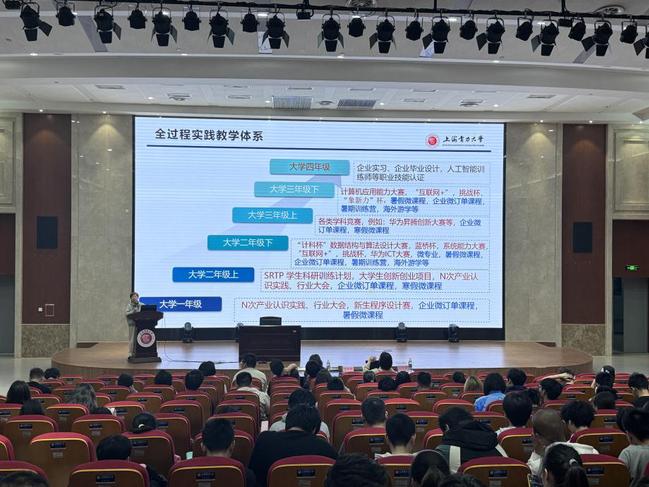计算机系主任叶文珺重点介绍了校企协同育人的具体举措,从各年级的具体学习内容着手,针对从大一、大二、大三、大四等学期惊醒具体讲解,包括产业认知实习、行业大会、参加SRTP学生科创训练计划、参加相关的计算机类赛事等讲解全过程实践教学体系的学习要求。
