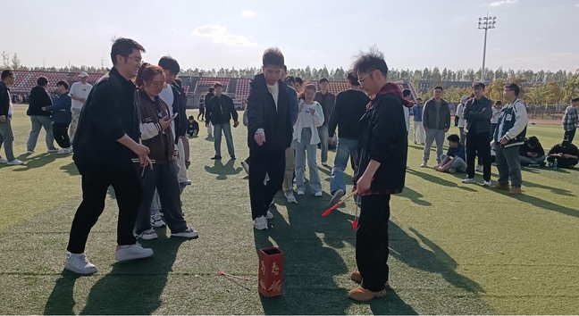 本次素质拓展活动设置珠行万里、环游世界、沙包投掷、投壶、拔河等特色活动,沙包投掷和投壶现场,同学们全神贯注,以精准的技巧展现风采;珠行万里中,团队成员默契配合,用接力传递的方式诠释协作智慧;环游世界项目则激发集体智慧,大家群策群力,在限时挑战中突破自我。活动中,导师们与学生并肩作战,共同制定策略、攻克难关;最后以专业为单位的拔河比赛将活动推向高潮,各专业参赛队伍士气高涨,随着裁判员的一声令下,双方奋力拼搏,全场师生齐心协力、鼓劲加油,场面气氛热烈。
