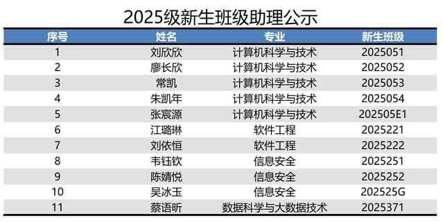 2025级新生班级助理公布如下: