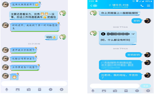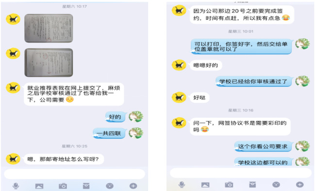 毕业班辅导员刘佳,在疫情期间及时帮助学生了解网签流程,协助邮寄纸质版三方协议、网签纸质版、就业推荐表等就业相关材料,同时帮助学生办理留学所需相关材料,并热心回答、解决同学们学业、就业方面遇到的各种问题。