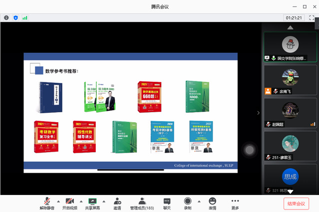 7月20日,3003新葡的京集团通过腾讯会议召开了2021届本科毕业生就业动员会暨考研交流会。院长温蜜、院党委副书记余南飞、副院长李晋国以及2021届全体本科生参加,会议由余南飞主持。
