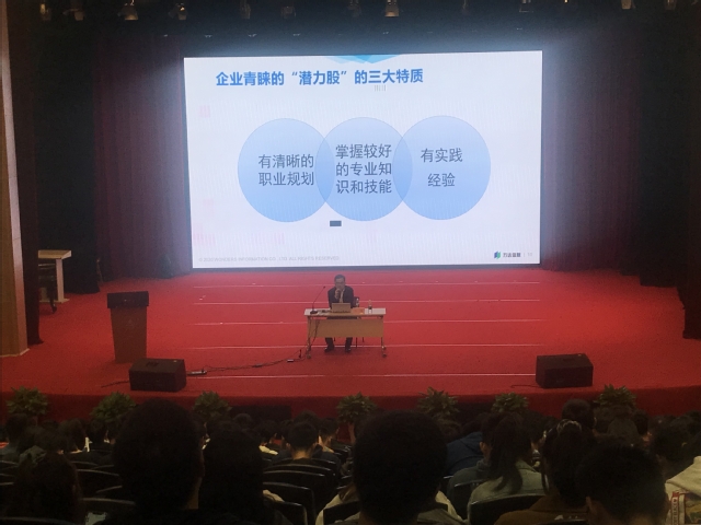 江峰以企业的视角分三个部分为学生开启了职业生涯规划教育。首先,他从万达信息股份有限公司的企业文化“价值源于专业,服务追求卓越”的理念,帮助学生分析了现代企业的文化现状,激发学生职业探索的兴趣。其次,他从当今企业的用人理念是什么、为什么要做职业规划、职业规划的作用是什么、如何做职业规划、如何成就职业理想五个问题,强调了树立目标、学会规划的重要性,指出学生在成长路上应该克服或解决的问题。最后,他与学生分享了其在成长路上的得与失,并指出作为新时代青年应当具有责任心,不要问国家给了我们什么,而是问自己能为国家做什么。