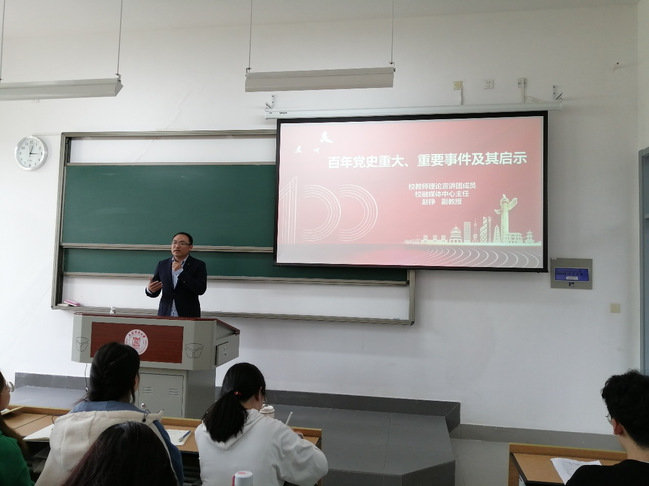 我校教师理论宣讲团成员周慧杰教授围绕“青春、奋斗、追梦”,从党的百年屈辱巨人跌倒、振兴中华初心不改、一百年追逐复兴梦三方面,鼓励青年大学生要不忘初心、牢记使命,要敢于担当、启航新征程,要作表率,坚定信仰跟党走,汲取开拓前行的精神力量,为实现中华民族伟大复兴贡献自己的力量。赵铮副教授做《百年党史重大、重要事件及启示》专题讲座,通过选取7个不同时期的历史重要事件阐述了中国共产党如何推动中国革命、建设、改革开放和迈向民族伟大复兴进程,内容深入浅出,将革命前辈如何将不忘初心、勇担使命践行在对国家对民族对人民的复兴大业上讲述的淋漓尽致。