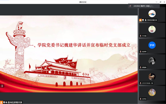 4月6日,3003新葡的京集团通过腾讯会议的方式召开学生党员疫情防控专题大会暨临时党支部成立大会召开,学习传达上级疫情防控精神,对学院各党支部疫情防控工作进行再安排、再部署。学院党委书记魏建华、副书记齐永晓、组织员聂坤、各党支部书记及全体学生党员参会。