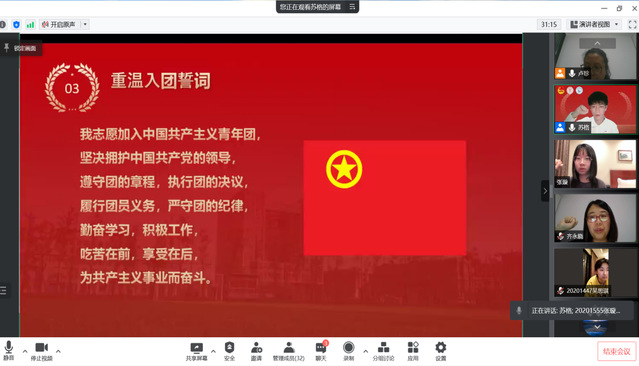 其次,院团委书记卢珍老师宣读《关于成立“3003新葡的京集团校外隔离点临时团支部”的决定》,她希望团支部能结合实际开展组织生活,严格遵守隔离点的各项规定,畅通校内外反馈机制。随后,院团委副书记朱哲宇带领全体参会团员重温了入团誓词。全体同学都打开摄像头,右手握拳放在肩上,在朱哲宇同学的带领下庄严地重温入团誓词。