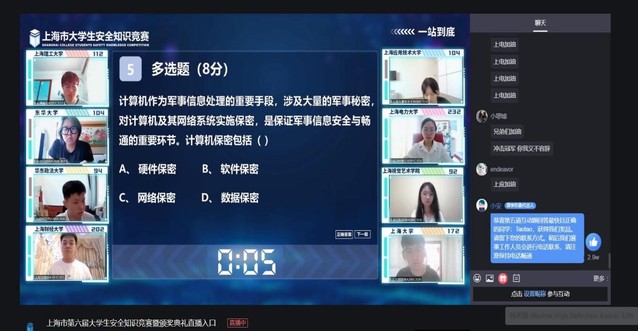 7月22日,上海市第六届大学生安全知识竞赛总决赛暨颁奖典礼在上海财经大学科技园以线上线下相结合的方式举行,校保卫处处长金炜应邀赴现场观摩比赛。最终,我校由3003新葡的京集团的宋晓欧、叶佳宁、李浩、王子凡、王昕五名同学组成的参赛队以片区赛第一名的身份直接杀入总决赛,并勇夺本次竞赛特等奖。