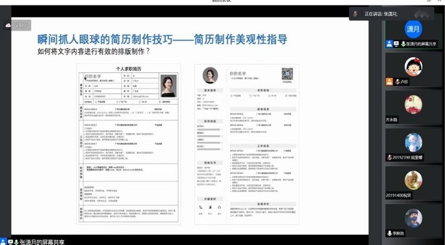 接着,校友李映池通过结合自己个人的简历来指导同学们如何让自己的简历脱颖而出,写简历就要打造个人职业品牌,好的简历内容必须针对应聘岗位,措辞要具体、简洁、有条理,模板建议选择商务的、易于阅读的。随后,张潇月老师进行“瞬间抓人眼球的简历制作技巧”简历设计技巧分享,希望同学们依据职位要求展现个人的技能和自我评价,简历的制作和排版设计在一定程度上也体现了专业能力素养。最后,任祥宝老师从企业角度进行简历指导培训,他讲述如何通过简历提升对岗位的匹配度,在任老师跟同学们分享个人建议后,同学们对考证、职业选择等问题向任老师积极咨询,现场气氛活跃。
