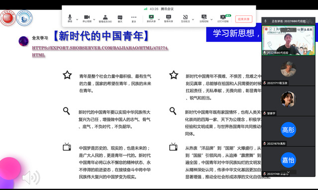 中国青年始终是实现中华民族伟大复兴的先锋力量。在首日教育中,各年级、专业还通过辅导员、学生干部领学,学生自学和研讨等形式,学习了《新时代的中国青年》白皮书。通过学习,引导学生坚守“永久奋斗”的光荣传统,在平凡岗位上奋斗奉献,在急难险重任务中冲锋在前,在基层一线经受磨砺,在创新创业中走在前列,在社会文明建设中引风气之先,生动展现出新时代中国青年的良好风貌。在“青年有话说”互动环节,学生就近期疫情、山火、地震等事件中展现的无数青年一代以青春之姿坚守在一线进行了热烈交流,纷纷表示作为清醒自知的青年,不能被“信息茧房”包围,把自己束缚在舒适圈中,而是应当对世界心存敬畏,正直有为。