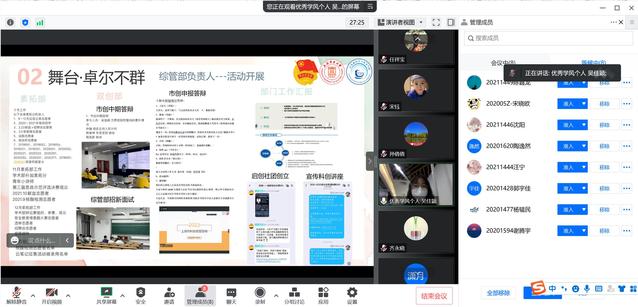 在答辩中,学生们个人从专业学习、社会工作、技能特长和主要荣誉等方面展现自己的优秀风采;各班级围绕班级基本情况、学业成果、科创荣誉和学风建设等展示了班级建设风采和学风建设成果。通过答辩评审,学院评定苏格、张璇、王传顺、张文馨、陶逸然、郭宇佳、杨韫民、吴佳颖等8名学生为2021-2022学年优良学风先进个人;评定202005Z班、2020252班、2020222班3个班级为优良学风班;推选2020321班为优良学风示范班并报校评审委员会审定。