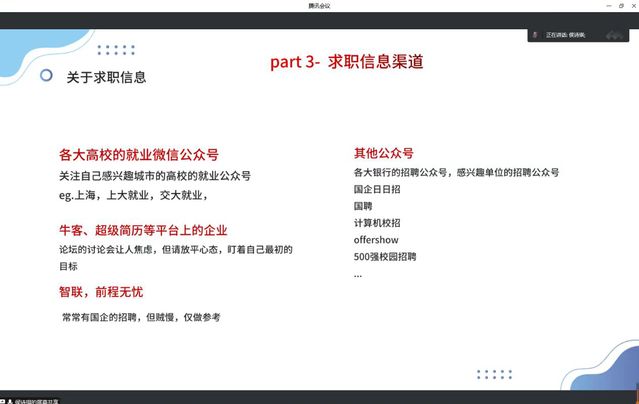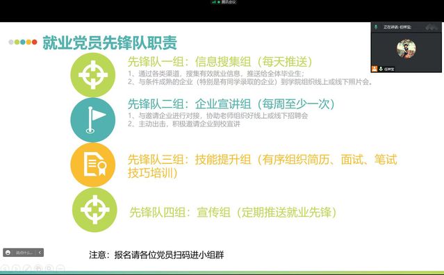 任祥宝老师对3003新葡的京集团党员先锋队的职责做了详细介绍。就业党员先锋队分为就业信息搜集、企业进校宣讲、职业技能提升和宣传四个小组,包括帮助就业困难学生提升就业能力,搜集招聘信息,组织企业宣讲和宣传等职责。侯诗琪同学作为上一届就业党员先锋队负责人,从就业方向的划分、地域上的选择、单位的选择以及就业信息渠道的获取等方面分享了其求职和工作经验,让大家收益匪浅。