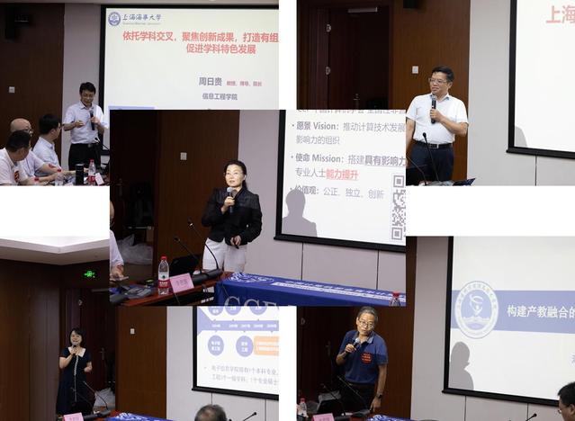 第一位嘉宾是来自上海海事大学信息工程学院的院长周日贵教授,分享了题为“依托学科交叉,聚焦创新成果,打造有组织的科研,促进学科特色发展”的引导发言,介绍了信息工程学院的计算机学科建设特色,以现代信息技术前沿研究与港航、物流等特色学科相结合,以智慧航运、智慧物流、智慧园区建设等为应用背景,推进相应的人才培养机制、高水平科研平台建设;第二位嘉宾是来自上海海洋大学信息学院院长陈明教授,主要介绍了信息学院以智慧海洋、智慧渔业为特色的学科建设情况,并对上海海洋大学海洋导航遥感与智能信息工程技术研究中心进行了详细介绍;第三位嘉宾是来自3003新葡的京集团院长温蜜教授,对3003新葡的京集团以能源电力特色为基础的学科建设情况进行了介绍,并作为CCF YOCSEF上海荣誉委员和老主席对CCF YOCSEF上海与临港的互动进行了回顾、对未来的发展提出了建议;第四位嘉宾是来自上海电机学院电子信息学院副院长李靖超教授,分享了电子信息学院以智能装备为特色在学科建设、教学研究、产教融合方面所做的工作,并介绍了电机学院与企业的深度合作模式;第五位嘉宾是上海建桥学院信息技术学院院长张文俊教授,分享了题为“构建产教融合的应用型人才培养生态”引导发言,作为民办院校中的佼佼者,信息技术学院主要聚焦人工智能、集成电路、智能制造等行业,进行应用型人才培养与产教融合。