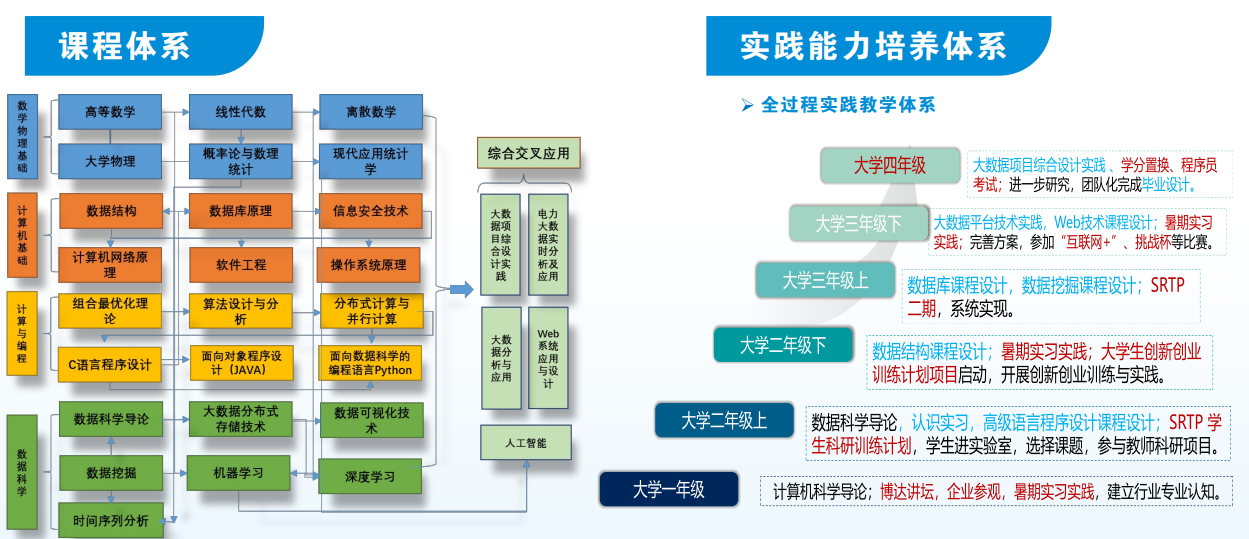 数据科学导论、数据库原理、数据结构、算法设计与分析、现代应用统计学、面向数据科学编程语言Python、大数据分布式存储技术、大数据分析与应用。
