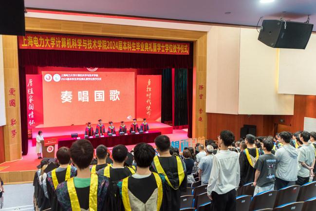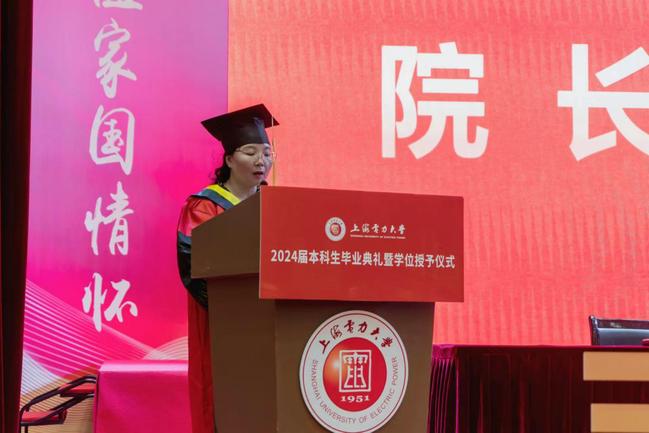 典礼在庄重的国歌中拉开序幕。首先,院长温蜜致辞,她代表学院向2024届圆满完成学业的毕业生表示衷心祝贺,临别之际,她对即将走出校门的毕业生提出三点希望:第一,希望同学们谨记“博达而砺行,谨严以求新”的院训,充分发扬上电计科前辈和学长们不惧挑战、敢为人先、勇挑重担的精神,成长为行业发展的中坚力量、中流砥柱。第二,希望同学们保持积极开放、合作共赢的心态和胸怀,不断地锤炼品德、锐意创新,为世界科技进步作出自己的贡献。第三、希望同学们能始终保持危机感,时刻准备迎接挑战,担负起民族复兴、国家崛起之重任。