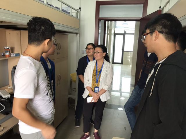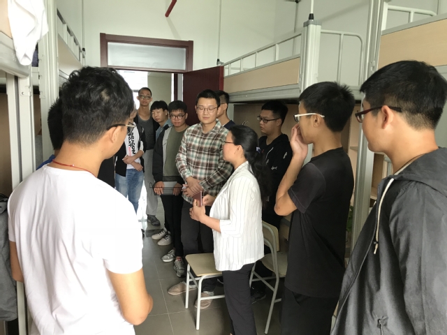 上午11时,温蜜老师、余南飞老师、和新生辅导员一起走进新生寝室,问候新生的住宿情况并耐心解答新生的问题。