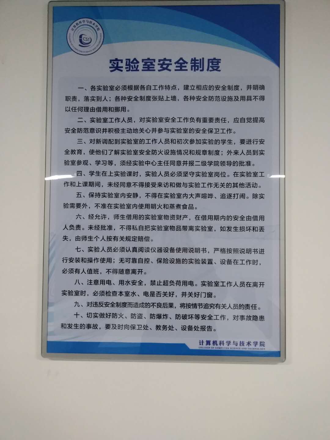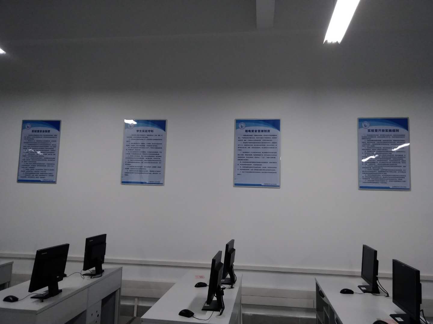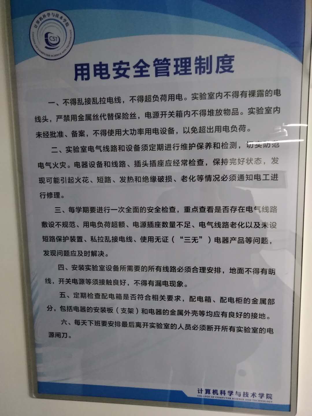 日将实验室安全规章制度、实验室用电安全规章制度、张贴到各个实验室,使每位来实验室上课的学生都有安全意识。